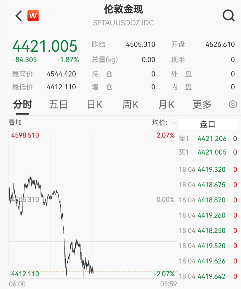 现货黄金盘中一度逼近4410美元/盎司,跌幅超2%。