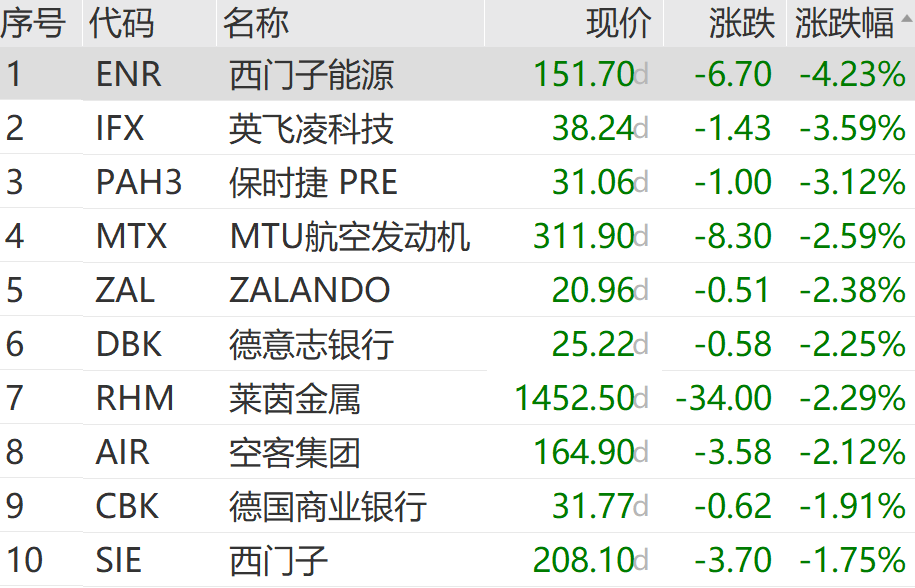 德国股市工业、能源板块走低,西门子能源、保时捷、莱茵金属等跌幅居前。