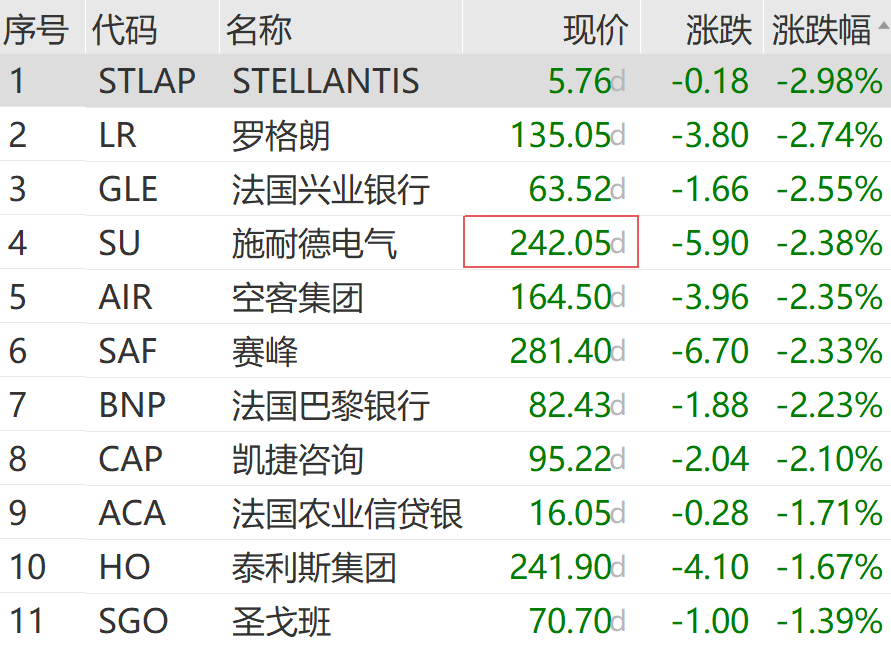 法国股市银行板块不振,法国兴业银行、法国巴黎银行、法国农业信贷银行等均有明显跌幅;罗格朗、施耐德电气、赛峰等跌幅靠前。