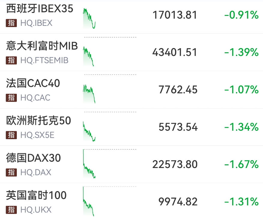 3月26日,欧洲主要股指盘初集体跳水,跌幅持续扩大。截至发稿,英国富时100指数、法国CAC40指数、德国DAX30指数等跌幅均超1%。